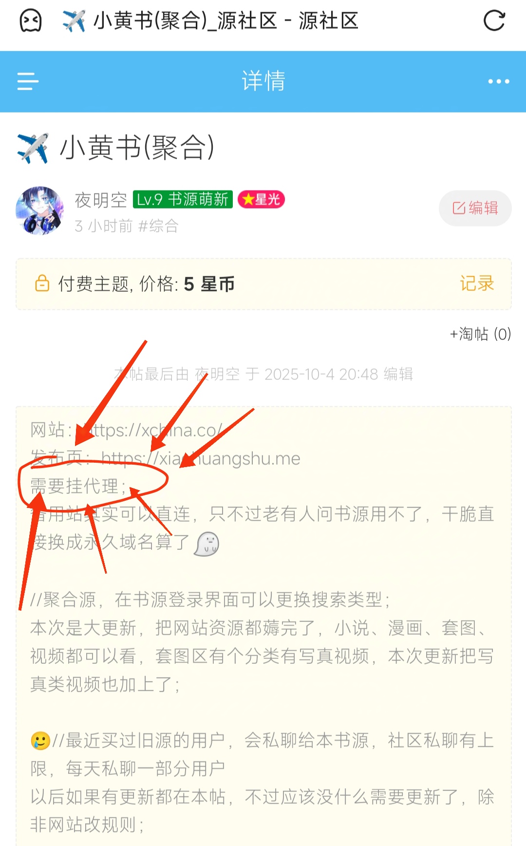 网站:https://xchina.co/ 发布页:https://xiaohuangshu.me ⚠️需要挂代理; 备用站可以直连,只不过老有人问书源用不了,干脆放永久域名了 ![]() //聚合源,在书源登录界面可以更换搜索类型; 大更新,把网站资源都薅完了,小说、漫画、套图、视频都可以看,套图区有个分类有写真视频,本次更新把写真类视频也加上了; 🥲//在旧帖买过小黄书源的用户可以去旧帖更新,旧帖开放到10月10号,没买过小黄书源的在本帖买,以后更新在本帖